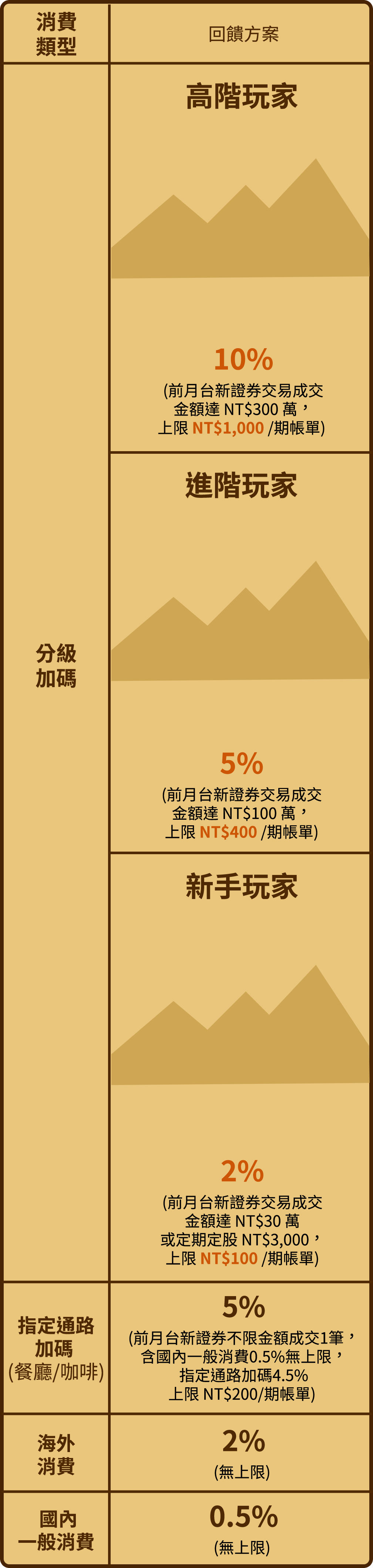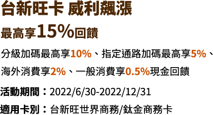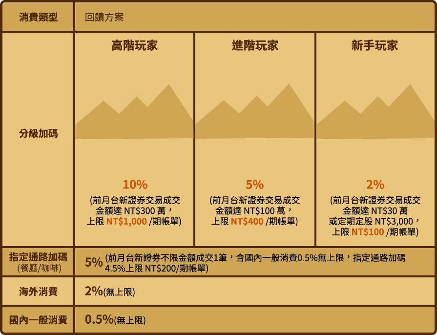 - (1) 高階玩家僅限台新旺世界商務卡(為邀請制,台新銀行與台新證券保有最終核准與否權利)
